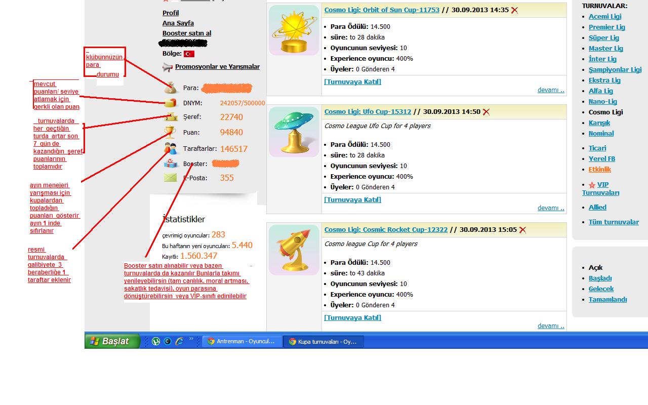 Para: Güncel para durumun DNYM: [size=4]Mevcut deneyim puanların/seviye barajı. Deneyim puanı en az seninle aynı seviyedeki rakiplere karşı aldığın başarılı sonuçlarla artar. Seviye yükselişi bu puanların birikmesiyle gerçekleşir! Şeref: Turnuvada her geçtiğin tur için şeref puanı alınıyor. Bu gösterge son 7 günde aldığın başarıları gösterir. Puan: Turnuvalarda aldığın başarının toplamıdır. Genelde aylık yarışmalarda en iyi menajerleri belirlemek için kullanılır ve her ay sıfırlanır. Taraftarlar: Galibiyetle taraftar sayısı artar, yenilgilerde azalır. Booster: Booster satın alınabilir veya bazen turnuvalarda da kazanılır. Bunlarla takımı yenileyebilirsin (tam canlılık, moral artması, sakatlık tedavisi), oyun parasına dönüştürebilirsin veya VİP-sınıfı edinilebilir (sadece satın alınmış booster ile). E-Posta Oyundaki kişisel posta kutun -------------------- BJK 1903
