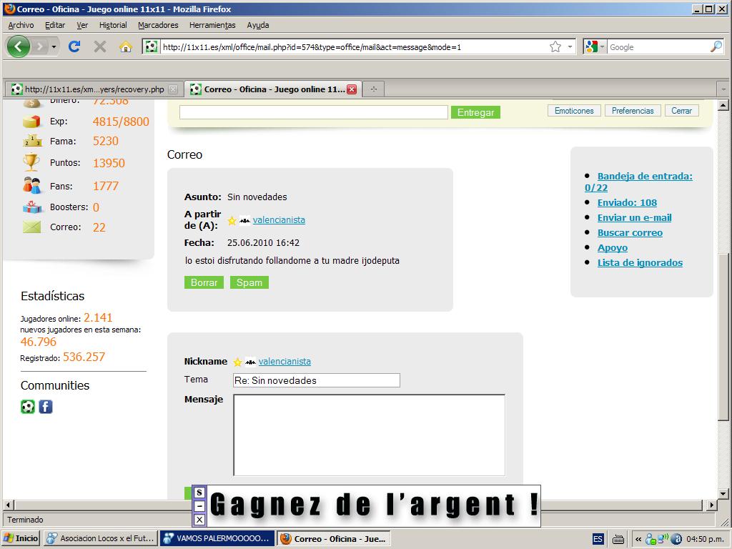 Me vi forzado a realizar este pots porq me parecio una gran falta de respeto a mi y a mi madre, q no tiene nada q ver en nuestras discuciones, y tampoco me parece correcto llegar a esto mientras hablamos de futbol!!.. Creo q a esta gente le falta un poco de educacion y respeto a los demas, porq ademas de esta sarta de insultos q me gane injustamente, tambien los hemos recibido todos los sudamericanos estos dias, por ser del 3 Mundo nos han tratado de personas de tercera, y no tengo pruebas de eso porq no pude tomar capturas. Pero de la falta de respeto y de los insultos que hablo son de un correo q me llego al juego enviado por el jugador valencista, no voy a repetir lo q me dijo solo pongo la imagen!, Espero una dura sancion, porq lo q me dijo no es para 2 dias de suspencion del juego es para mas!! si dije eso sera porque el ante me pregunto algo no creen? |