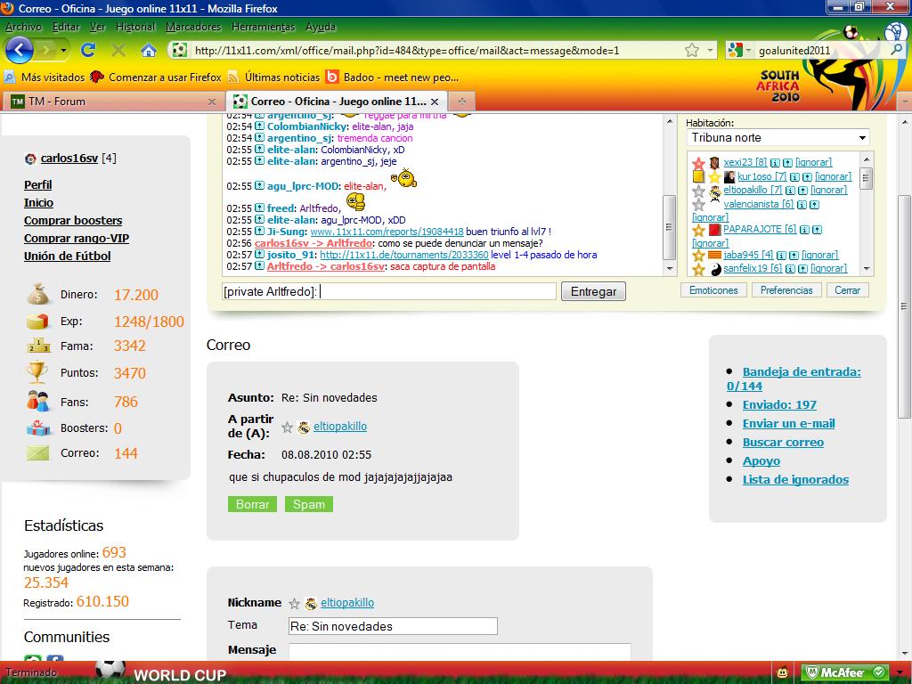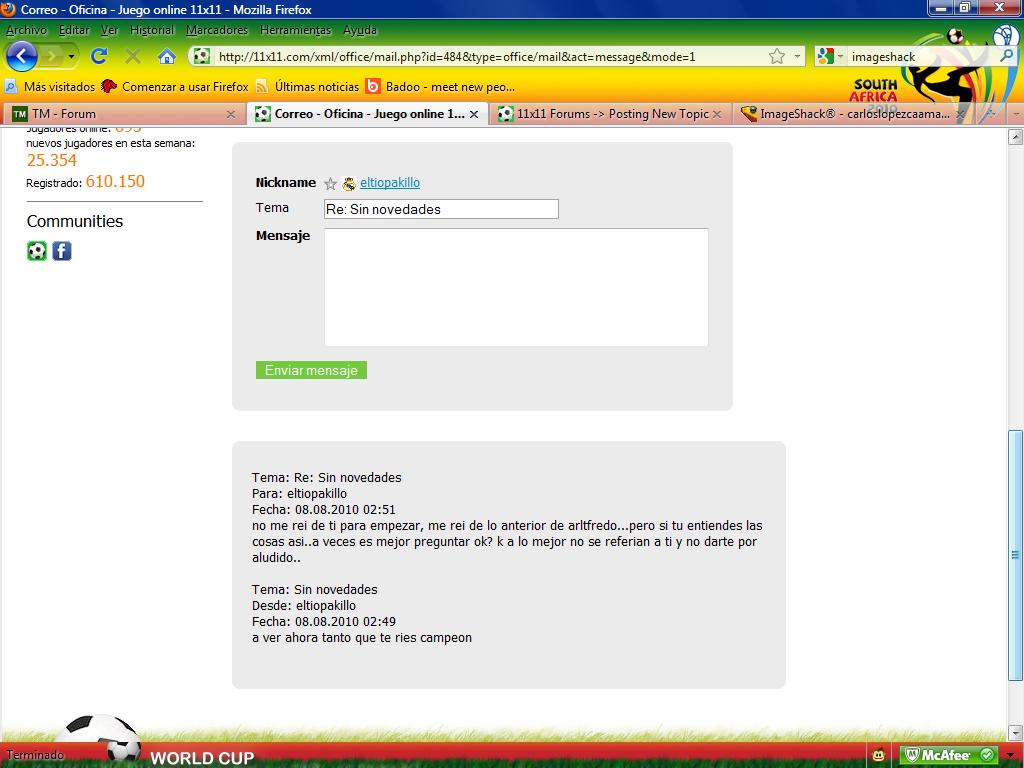 hola, he hablado con el mod para preguntarle donde va esto y me ha dicho que lo ponga aqui, un usuario del cual ya vereis ahora la captura, primero me dijo en el chat que se reia en mi cara en plan sobrao y despues como lo echaron del chat, antes del partido que nos enfrentaba me envio este mail, y creo conveniente que se vea, es mas me mandaron hacerlo. nada que hagais lo que podais... pongo las dos porque no se como quedaria gracias!! http://yfrog.com/5minsulto1gj http://yfrog.com/nainsultovj[/img] Muchas gracias por tu colaboracion, no te preocupes esta en proceso la correspondiente sancion |