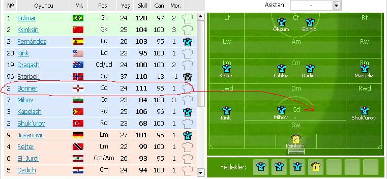 hayır. yedeklerde değil. şöyle de anlayabilirsin, defansta tek oyuncu olduğu zaman direk ortada duruyo, benim defansta gözüken "mihov" adlı oyuncum sol tarafta duruyo, yani yanında normalde bi oyuncu daha var. daha iyi anlaşılabilmesi için tekrar bi prntscrn yapıp yollucam. hep oluyo çünkü bu sorun bana =))