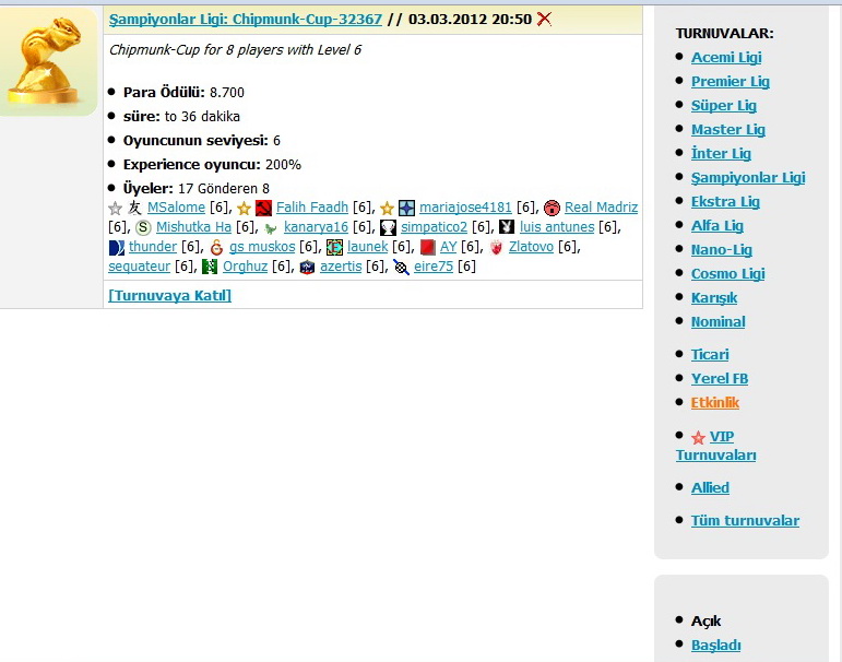 Aşağıdaki resimde göründüğü gibi OYUNLAR--->KUPA TURNUVALARI kısmına tıkladığımızda açık kupaları listeleyebiliriz. Açık olan kupalar 15 dk içinde başlayacak olan kupaları gösterir. Sağ altta açık-başladı-gelecek-tamamlandı gibi sekmeler görünüyor. Buradan başlamış,tamamlanmış veya başlayacak olan kupalara bakabiliriz.
